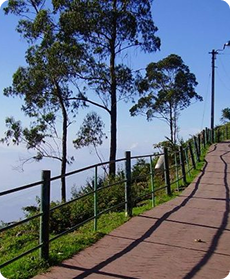 A scenic pathway offering breathtaking panoramic views of valleys and misty mountains, perfect for leisurely strolls in refreshing mountain air