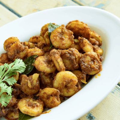 Marinated Prawns cooked in Coconut oil in traditional Alapy Style