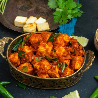 Cottage cheese with olive oil marinated with Tandoor Masalas cooked in Clay pot.